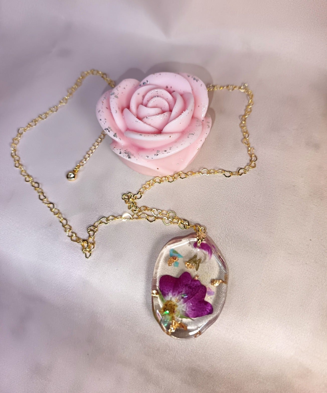 Accenti dorati, una piccola farfalla e petali delicati si incontrano in questo ciondolo artigianale, sospeso su una catena placcata oro con dettagli.