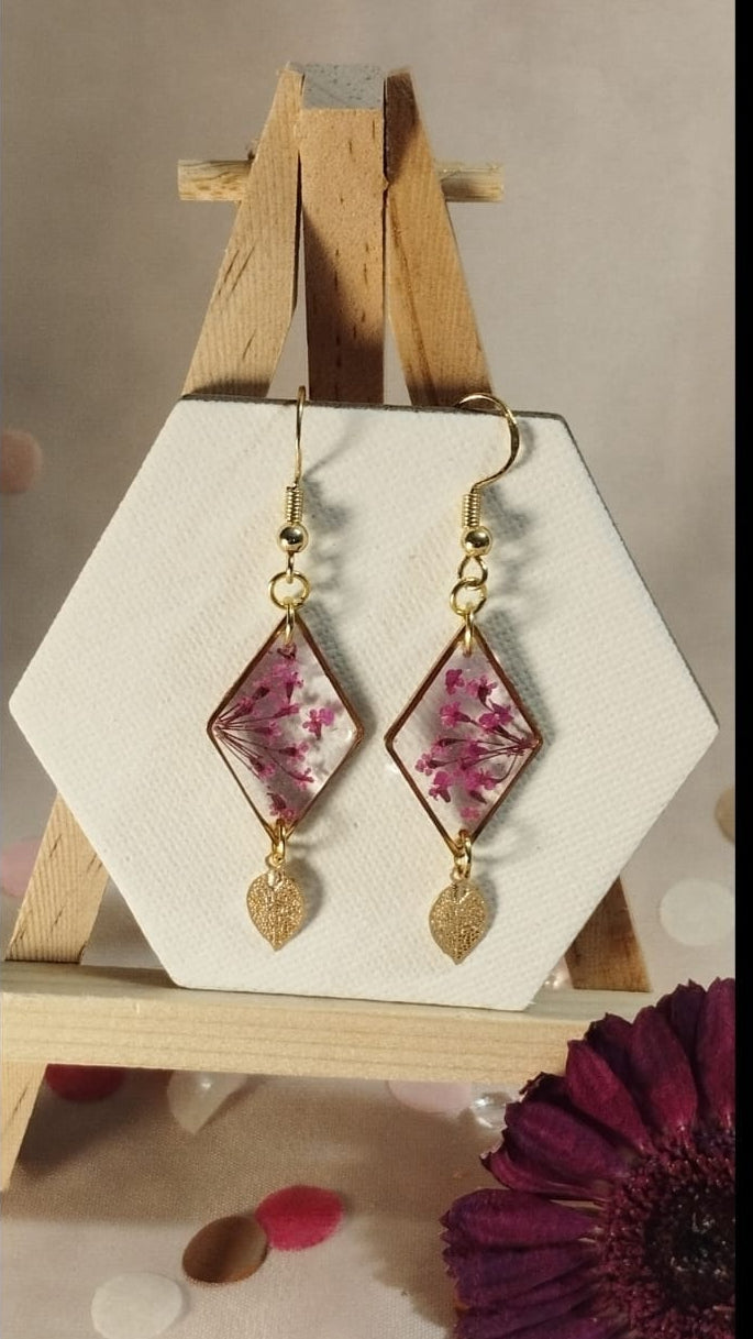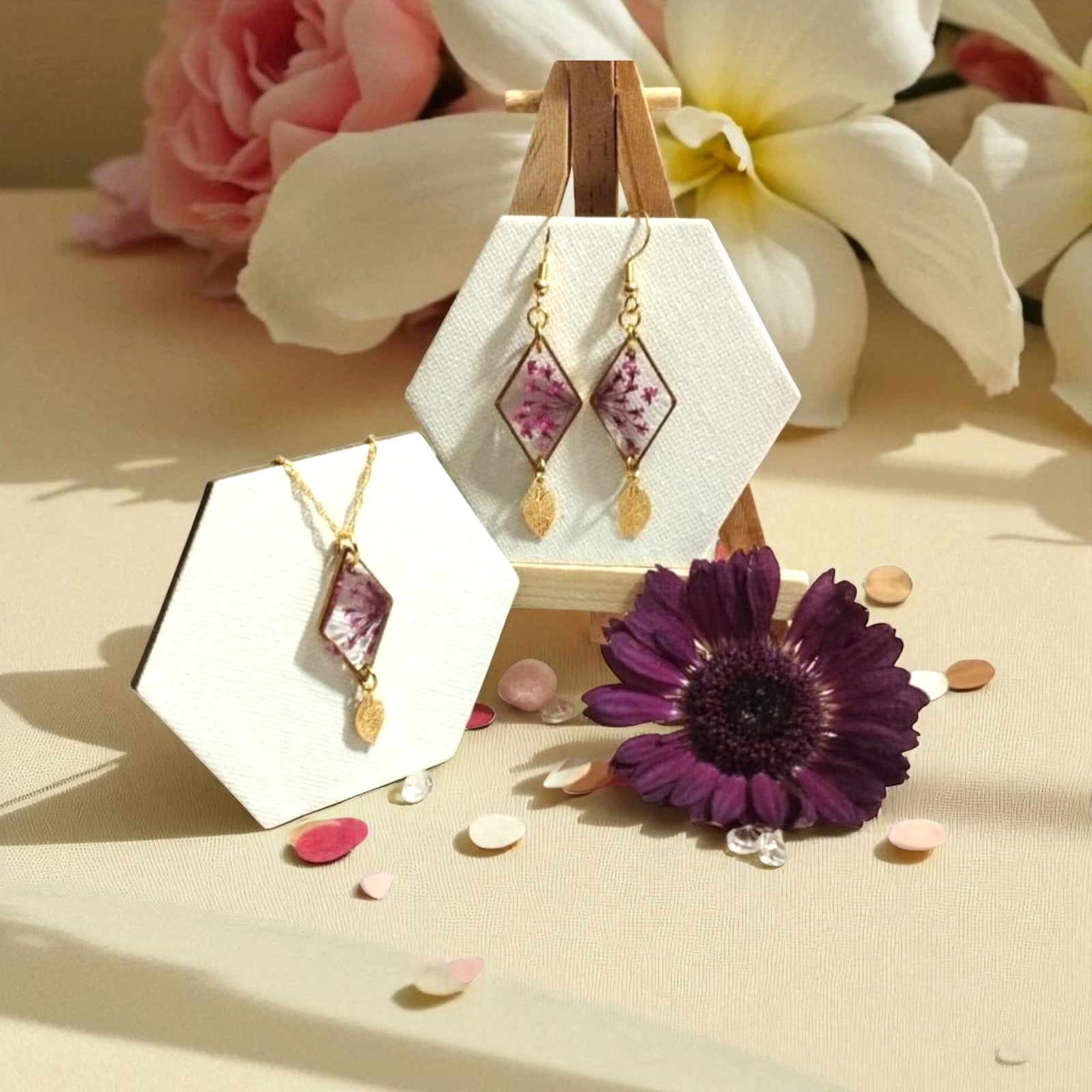 Fiorellini veri essiccati, resina cristallina e dettagli dorati: questa parure nasce per accompagnarti con delicatezza in ogni giornata.